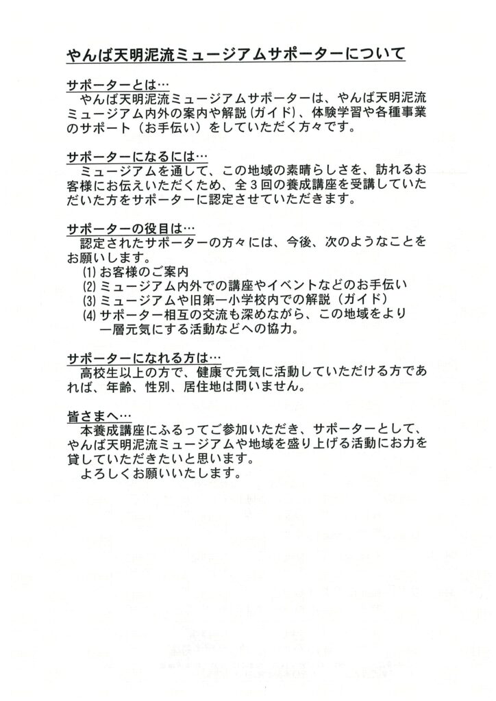 館内外の案内や解説(ガイド)、各種活動にお力を貸して頂ける、「やんば天明泥流ミュージアム」のサポーター養成講座を開講します。全ての講座を受講された方を「やんば天明泥流ミュージアムサポーター」に認定させていただきます。奮ってご参加いただき、やんば天明泥流ミュージアムにお力をお貸しください。