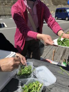 ゴール地点で、山菜のお浸しの差し入れ