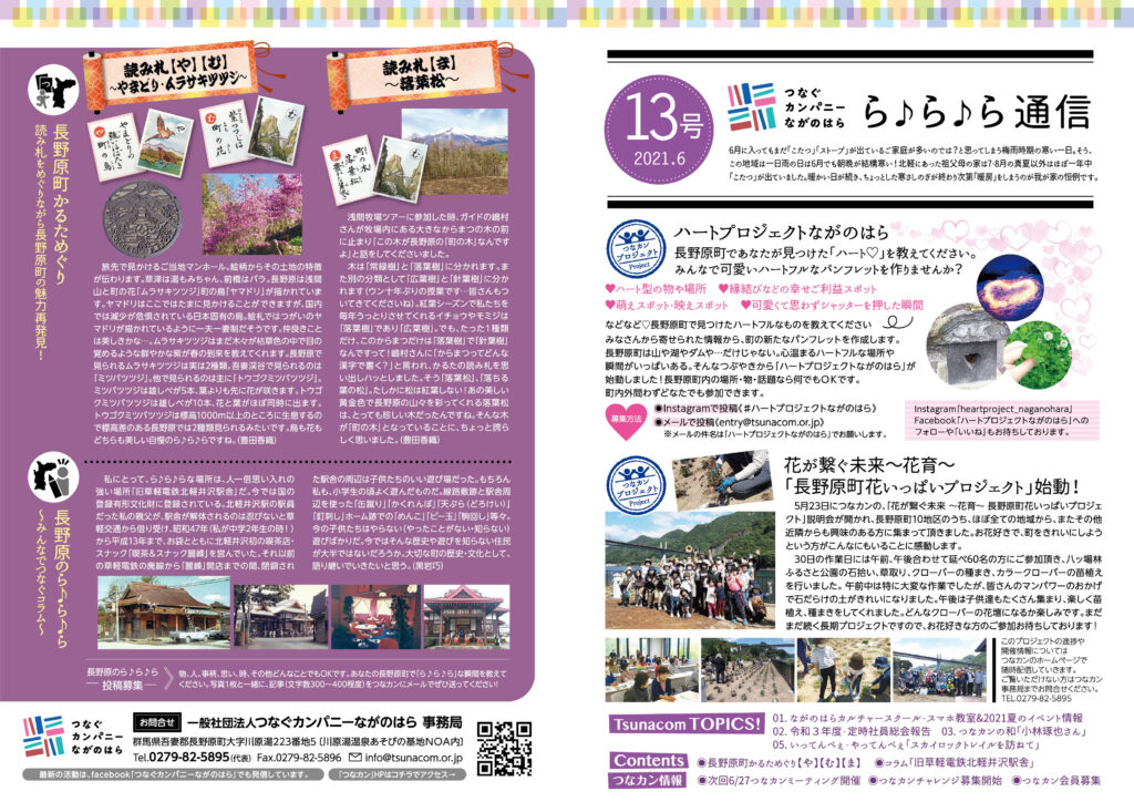 読み物は、「広がるつなカンの和」、長野原町の魅力発見として「いってんべぇ、やってんべぇ」、「長野原町かるためぐり」。みなさんでつないでいくコラム「長野原のら♪ら♪ら」等です。