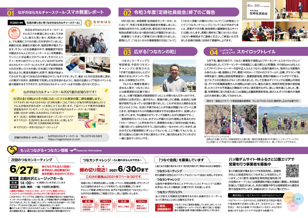 つなカンプロジェクトは、新しく始まった「ハートプロジェクトながのはら」の紹介、みなさんの力で動き始めた「花が繋ぐ未来~花育~ 長野原町花いっぱいプロジェクト」の活動報告。