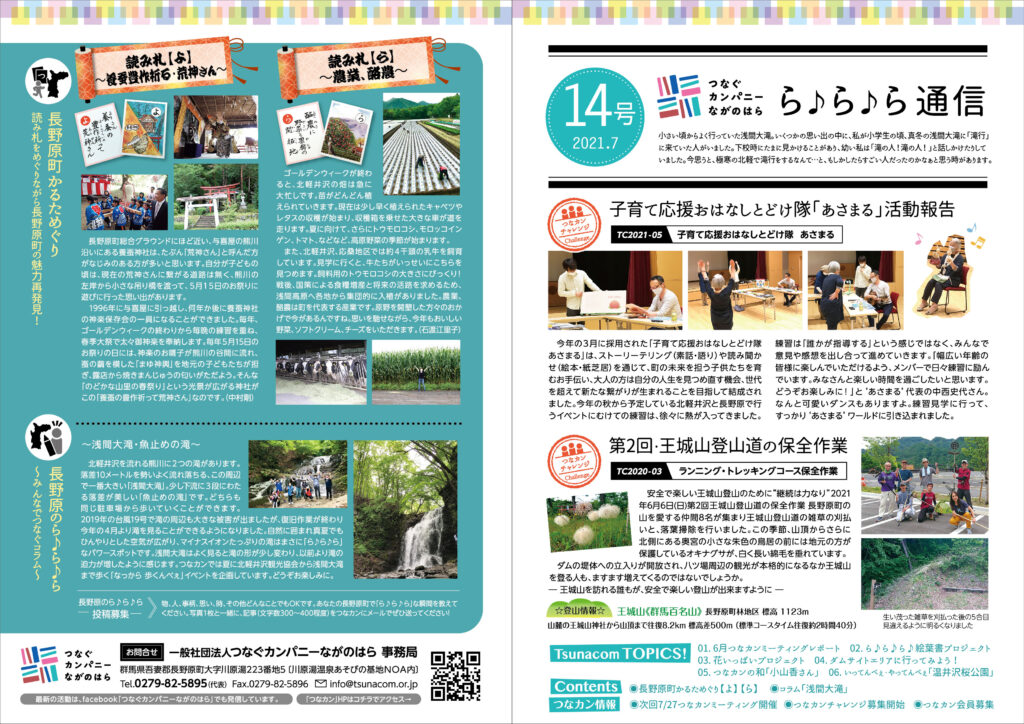 「つなカン」から皆さまへ、「つなカン」の活動や、町の魅力を「つなカン」目線でお届けする刊行物「ら♪ら♪ら通信」。第14号を7月13日より町内全戸配布しています。
