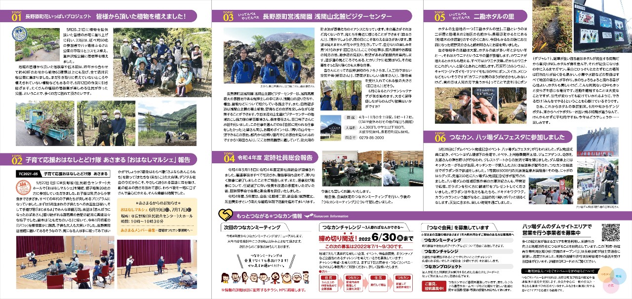 活動報告は、令和4年度 定時社員総会。つなカン事業「ふるさと再発見」。つなカンプロジェクト「花が繋ぐ未来の長野原~花育~ 長野原町花いっぱいプロジェクト」。つなカンチャレンジ「子育て応援おはなしとどけ隊〝あさまる〟」など。