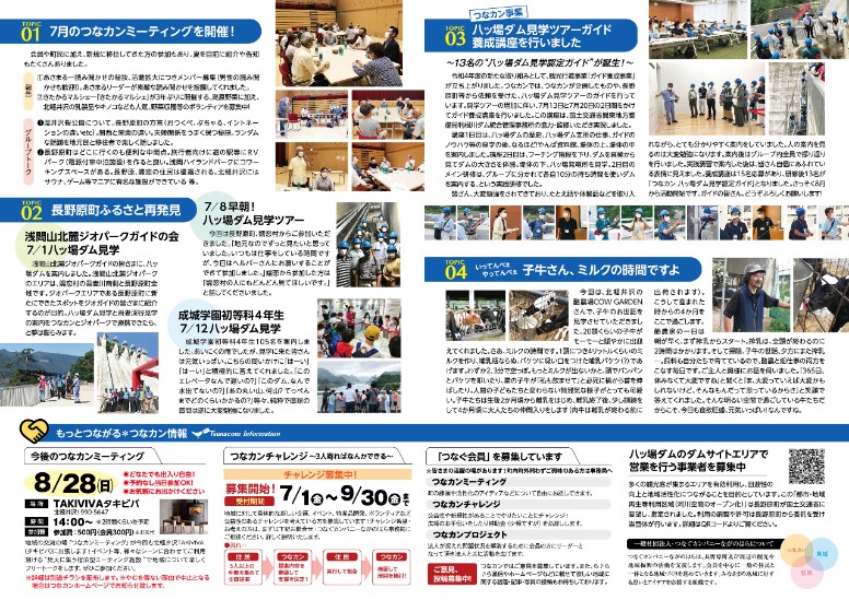 活動報告は、7月末で、つなカンチャレンジ期間が終了する「子育て応援おはなしとどけ隊〝あさまる〟」。つなカン事業「7月つなカンミーティング」、「八ッ場ダム見学ツアーガイド養成講座」、「長野原町ふるさと再発見」。