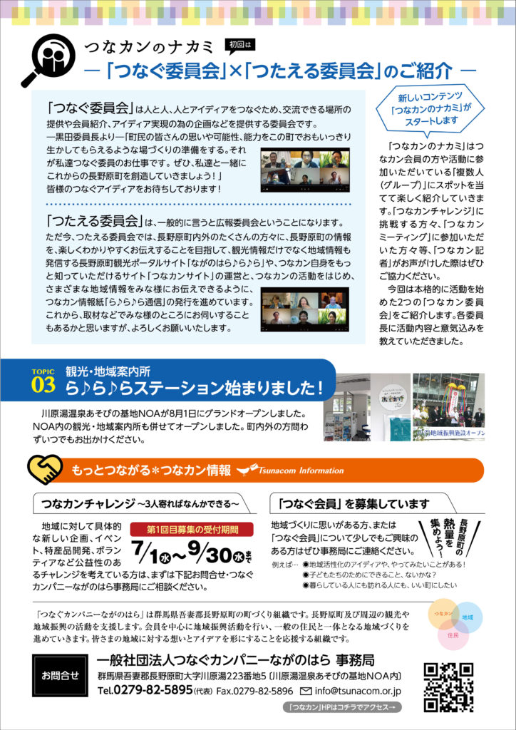 「つなカン」から皆さまへ、さまざまなお知らせを掲載する刊行物「ら♪ら♪ら通信」。その第3号を8月18日から町内全戸配布しました。
