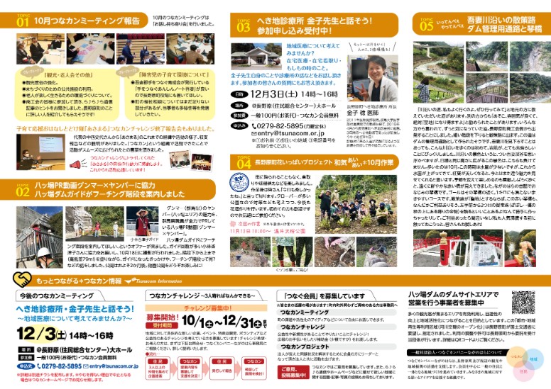 活動報告は、「長野原町ふるさと再発見」より、八ッ場ダム見学 初めてのナイトツアー、つなカン事業「つなカンミーティング」、つなカンプロジェクト「花が繋ぐ未来の長野原~花育~ 長野原町花いっぱいプロジェクト」など。告知は「へき地診療所 金子先生と話そう!」です。