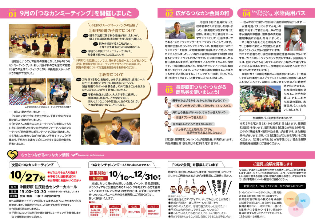 今号より紙面を拡大し、内容は9月27日に行われた「9月つなカンミーティング」の報告、新会員の紹介。長野原町の魅力発見として「いってんべぇ、やってんべぇ」、「長野原町かるためぐり」。また、みなさんでつないでいくコラム「長野原のら♪ら♪ら」が始まりました。ぜひご覧ください。