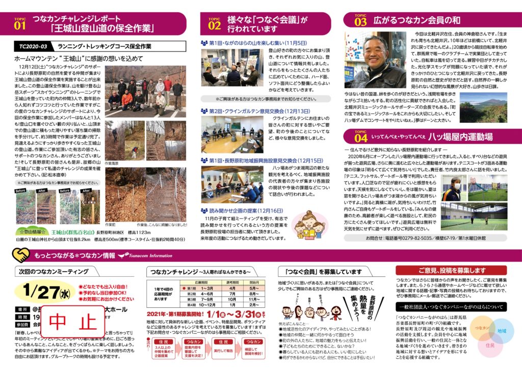 ら♪ら♪ら通信内で告知しております「1月27日 つなカンミーティング」は、コロナウイルスの感染拡大状況の悪化に伴い中止させていただきます。