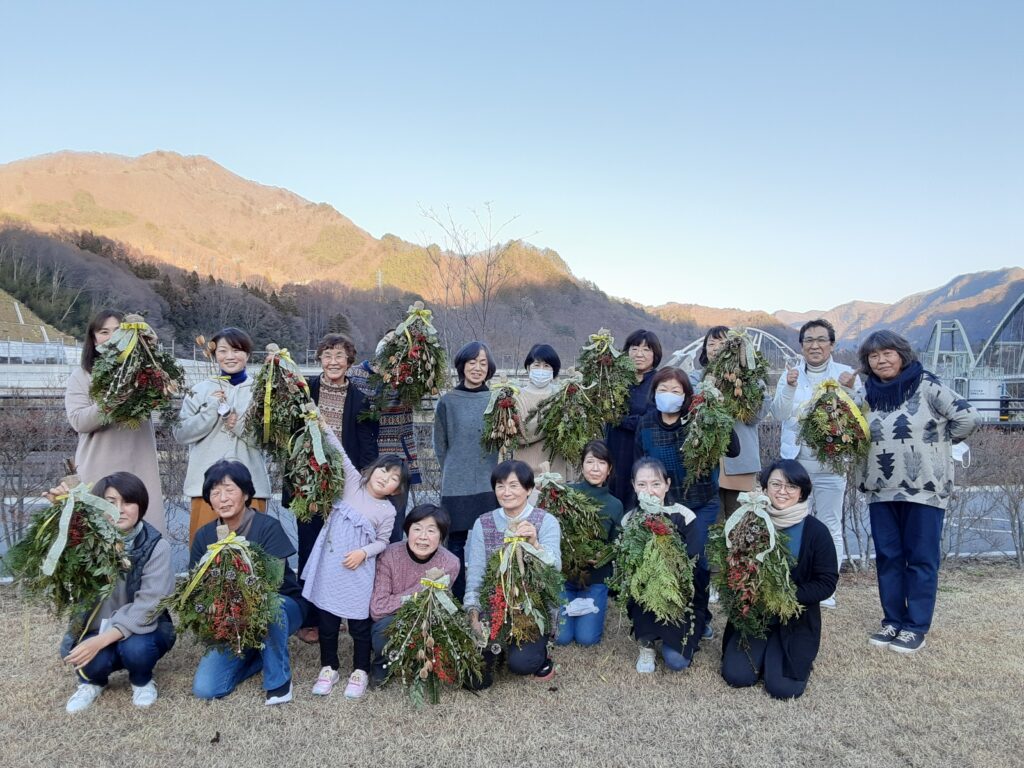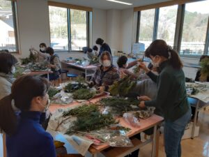 長野原町花プロジェクトのサブリーダーでもある秋山貴子先生に作り方を教えて頂き、スワッグに使う植物は地元の方々のご協力で、町内の森の枝や木の実がたくさん集まりました。いつも花植えの作業を黙々と行ってくれている皆さんも、この日は和気あいあいとスワッグ作りに夢中。