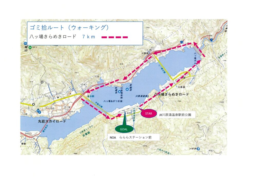 『八ツ場あがつま湖の観光を楽しみながら、健康的にゴミ拾い』をコンセプトにJR川原湯温泉駅前をスタート。八ツ場ダムや湖の駅丸岩でプチ観光を楽しみながら八ツ場あがつま湖の外周をぐるっと一回りし、路上にポイ捨てされた空き缶、ペットボトル、コンビニ弁当の容器、タバコの吸殻等々でゴミ袋がいっぱいになりました。