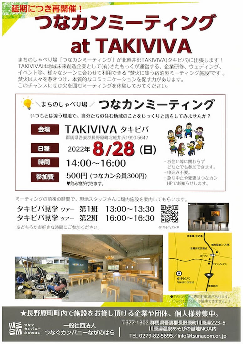 8月のつなカンミーティングは2月にコロナウイルス感染拡大の影響で延期をしていたTAKIVIVAミーティングを開催します。