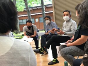 6月のつなカンミーティングは北軽井沢ミュージックホールで「地域コミュニティーを考える」を共通テーマに2グループに分かれて話しました。